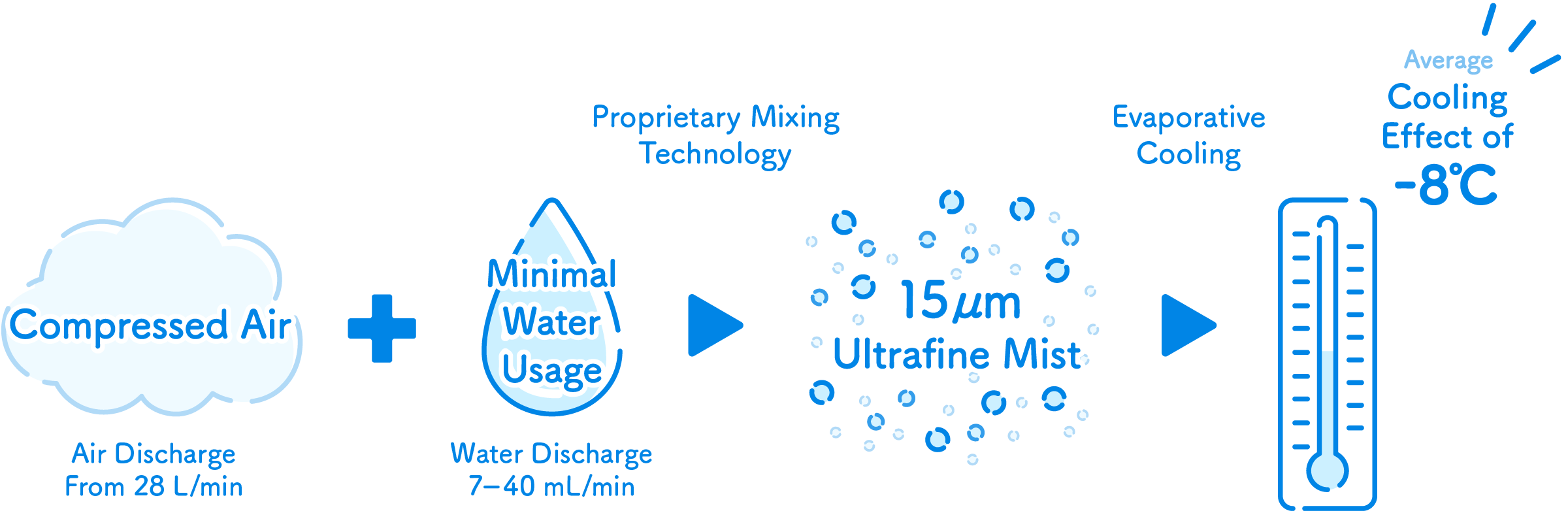 Uses only compressed air (2 L/min) and water (7–40 L/min) to reduce surrounding temperature by up to 8℃.