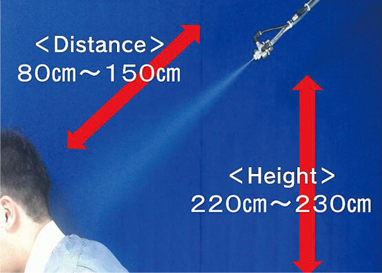 - The ideal mist nozzle height is 2,200–2,500 mm above the floor. It should be installed 80–150 cm from the operator so that the mist hits around the neck area.